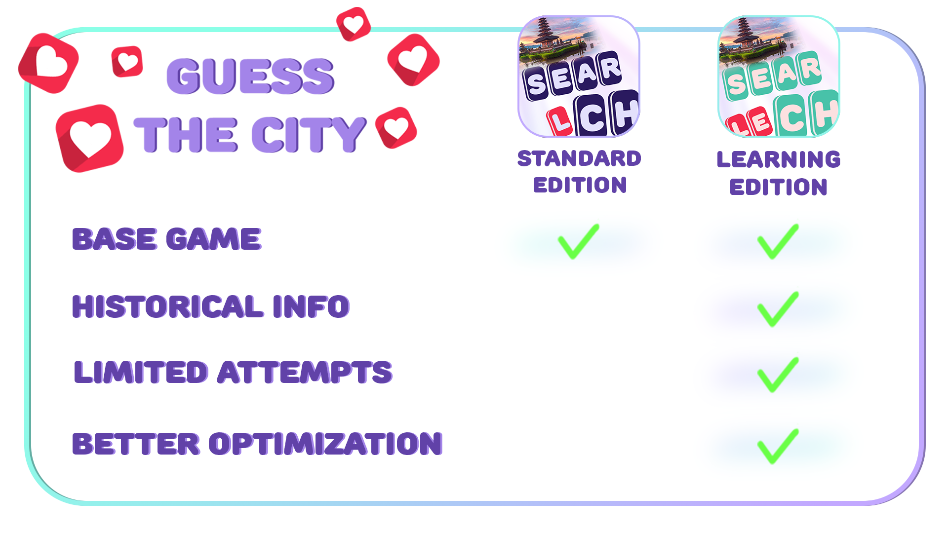 Guess the City Learning Edition is perfect for kids and teens. Discover fun facts about world landmarks while on the go or during a lunch break — nothing can stand in the way of curiosity!